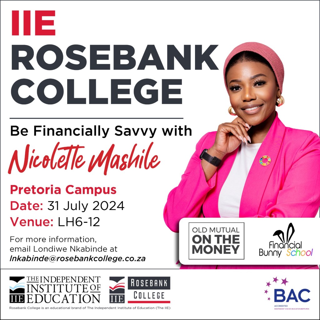 Nicollete Mashile is a Bushbuckridge born entrepreneur, financial adviser, renowned award winner. She was invited at the IIIE Rosebank College Financial Workshop on the 31 of July 2024 as a guest speaker to speak and educate students on how they should be able to handle and manage their money.